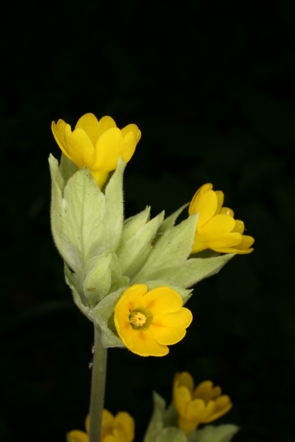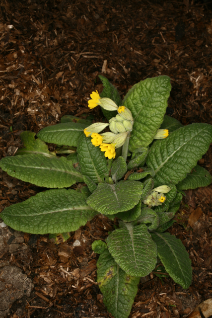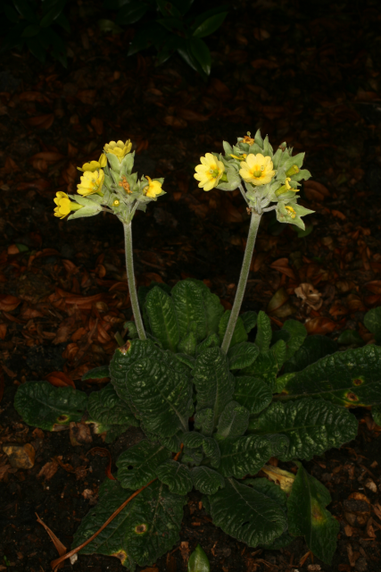 Very variable, rosette-forming, evergreen or semi-evergreen perennial with oblong-ovate to ovate, sometimes scalloped, mid-green, rough- textured leaves, to 20cm (8 inch) long. In mid- to late- spring, flower stems rise above the basal leaves, 15-20cm, and are topped by umbels of 2-16 salverform, nodding, fragrant, deep yellow flowers, 1.5-2.5cm across. 25 cm (10 in) high and wide.