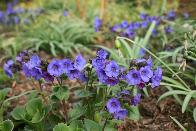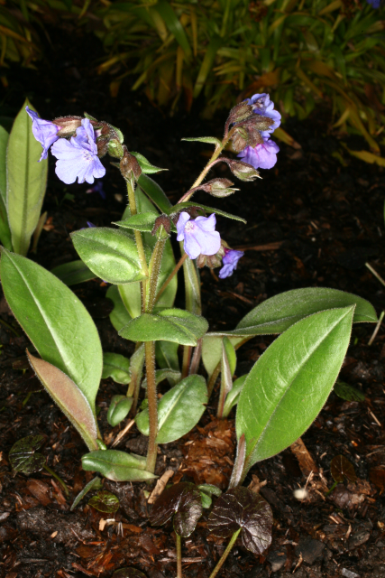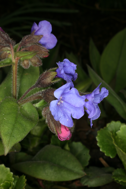 Pulmonaria L. Boraginaceae Cultivar 'Blue Ensign' has blue flowers. Distribution: Europe. Pulmonaria or Lungwort are names for a lichen and a perennial plant in the Boraginaceae. This is the latter. Lyte (1578) has a woodcut of our plant and also calls it Sage of Jerusalem and says it is of 'no particular use in physicke, but is much used in meates and salads with eggs, as is also Cowslippes and Primroses, whereunto in temperature it is much alike.' He lists and describes the lichen separately. Culpeper (1650) said he found many sorts of lunguewort in perusing Authors ' Pulmonari, arborea and Symphytum maculosum [and the latter is our plant, the others the lichen] and that they 'helpe infirmities of the lungues, as hoarseness, coughs, wheezing, shortnesse of breath etc.' Coles (1657) who espouses the Doctrine of Signatures in a way unrivalled by any other English author, might have been expected to confirm the concept that the mottled leaves looked like the cut surface of a lung which indicates their purpose, but he only mentions the lungwort which is a lichen. However, Porta's beautiful book on the Doctrine, Phytognomica (1588), is clear that the plant called pulmonaria with hairy leaves like a bugloss, spotted white with purple flowers, commonly called 'cynoglossa' [with a woodcut which could be Pulmonaria officinalis] indicate its use for ulcerated lungs, spitting blood, shortness of breath and asthma equally with the lichen with the same name. Lobel & Pena (1570) call it 'PULMONARIA, masculosa folia Borrago. floribus Primula veris, purpureis [PULMONARIA spotted, Borage-leaved, flowers like Primula veris - Cowslips - purple]' and say that women mix the leaves with a little broth and make it into an omelette for lung disorders and to strengthen the heart Lobel (1576) calls it Maculosa Pulmonaria and describes a white flowered form with a good woodcut. Gerard (1633) uses the same woodcut as Lobel and calls it Pulmonatia foliis Echii, Buglosse Cowslips with red flowers, and a woodcut of a narrow leaved plant as Pulmonaria masculosa, Spotted Cowslips of Jerusalem with red, blue and purple flowers and says 'the leaves are used among pot-herbes. The roots are also thought to be good against the infirmities of ulcers of the lungs...'. Quincy (1718) writes: '... it has a glutinous juice ... and heals ulcers and erosions. It is commended in coughs and spitting of blood but is little used either in the Shop or Prescriptions'. Not used in modern medicine. It is in the family Boraginaceae whose species are often rich in pyrrolizidine alkaloids that cause liver toxicity and liver cancers, but levels in Pulmonaria officinalis may not be significant.