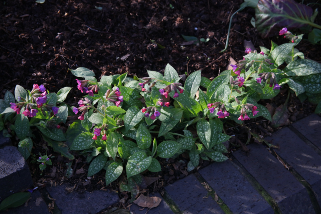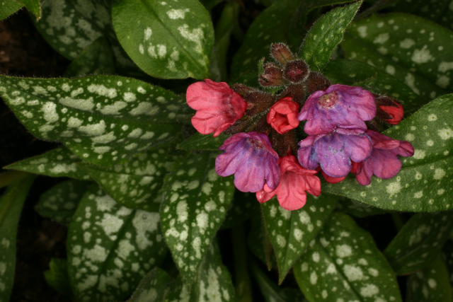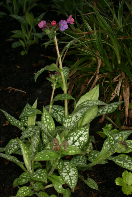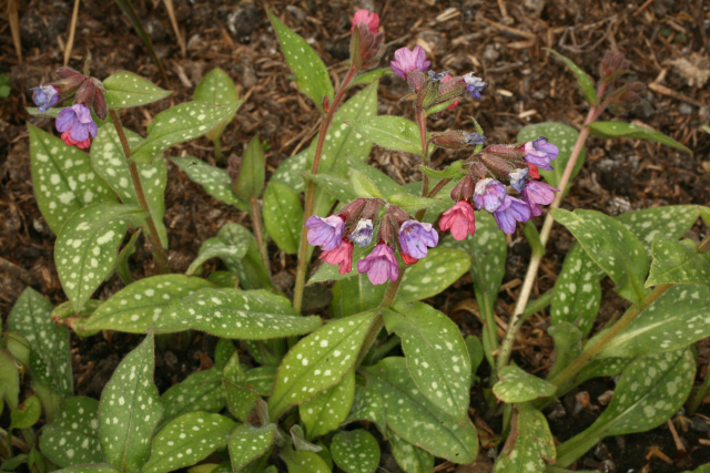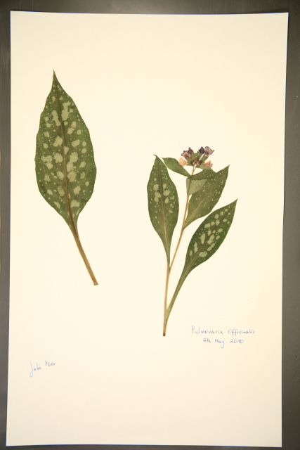 Lyte calls it Pulmonaria, lungwort, Symphitum sylvestre or wild comfrey, sage of Jerusalem, cowslip of Jerusalem and our ladies milkeworte (‘because the leaves be full of white spottes as though they were sprinkled with milke’).