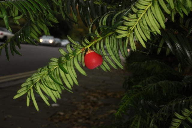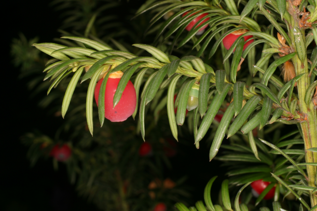Eating the needles or fruit (seeds) causes primarily slowing and weakening of the heart and inhibition of intestinal movements. The result is weakness, vomiting and diarrhoea, broadening of the ECG, disorders of intracardiac conduction and finally death mainly due to hypotension, seizures and ventricular dysrhythmias. The LD50 (fatal dose) of needles is about 0.7-2g/kg in most mammals depending on age and weight. It is some 8-times less toxic in the chicken.