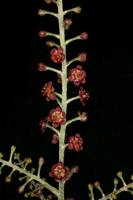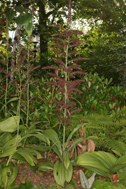 Rhizomatous perennial producing broadly elliptic, pleated basal leaves, to 35cm long, and a few stem leaves. In early and mid-summer, they bear numerous star-shaped, reddish brown to almost black flowers, 1.5-2cm across, in erect, terminal, freely branched panicles, to 60cm long. 2m high by 60cm wide.