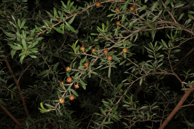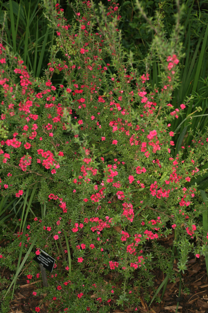 Leptospermum scoparium J.R.Forst & G.Forst Myrtaceae. New Zealand tea tree, manuka, manuka myrtle. ‘Red Damask' is a cultivar with the RHS Award of Garden Merit. Distribution: New Zealand and southeast Australia. A red-flowered form. Important in New Zealand as the source for manuka honey. The leaves were reputed to have been used to make a tea by Captain James Cook (1728-1729) on his voyages to Australia and New Zealand. Johan and George Forst, father and son, were the scientists on Cook's second voyage (1772-1775). It produces an essential oil.
