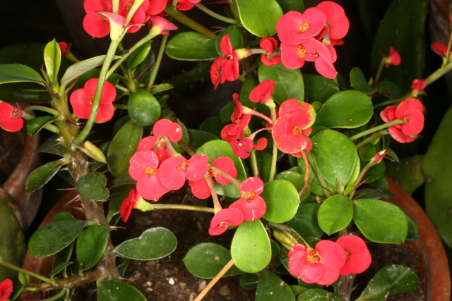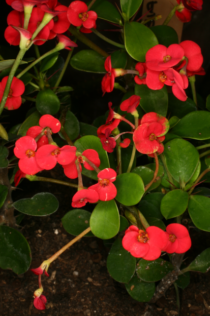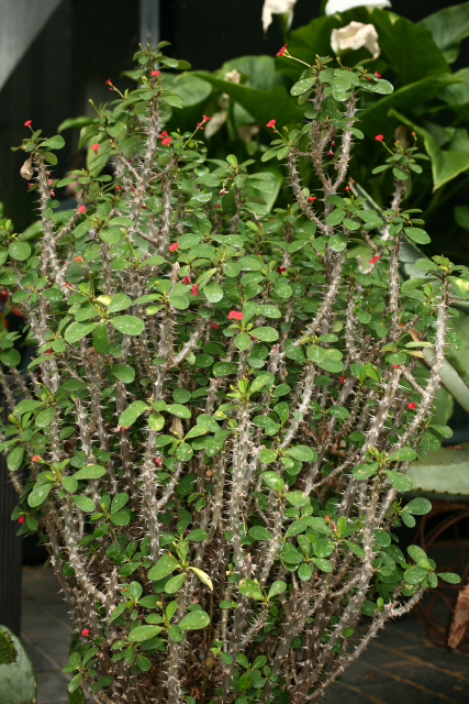 Bushy, slow-growing, mainly evergreen, semi-succulent shrub with slender, fleshy, thorny stems and branches; the well0spaced thorns are wider at the bases. Bright green leaves, 3.5cm long, are obovate, pointed and tough. Yellow cyathia, enclosed by very intense red involucres, are borne in axillary cymes in spring or summer. 1m high and 45cm wide.