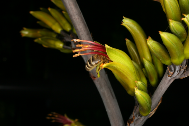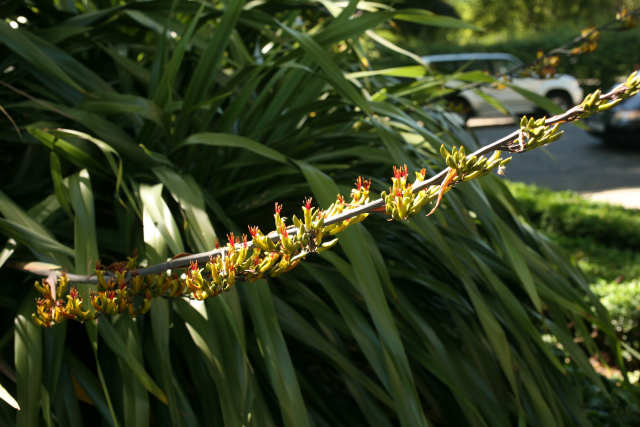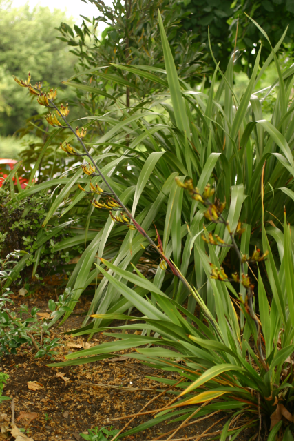 Previously identified as Phormium tenax, a visitor recognised it by its yellow green flowers and pendulous twisted seed pods as being Phormium cookianum. Phormium tenax has red flowers and upright seed pods. However Kew have recently changed the name on the basis of priority to Phormium colensoi (named after the Rev. William Colenso printer to the Missionary Society who helped J D Hooker with his flora of New Zealand) as this name was validly published (but overlooked) on January 1 1848, and it was only given the name Phormium cookianum (named for Captain Cook) a few months later in the same year. Ours appears to be the lowland form from North Island with yellow-green tepals whereas the mountain form from South Island has red tepals
