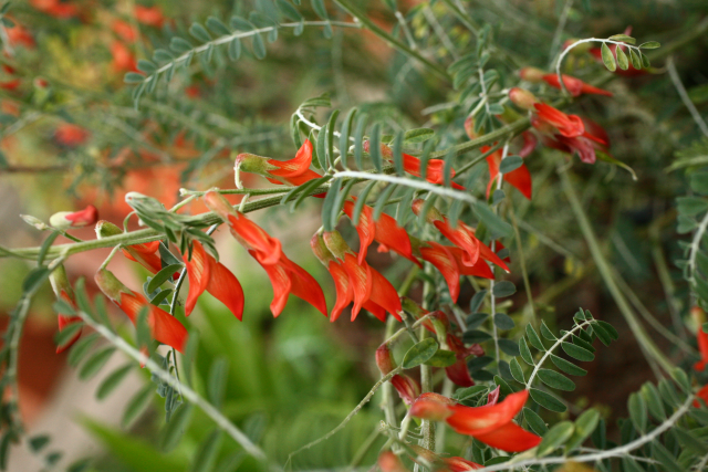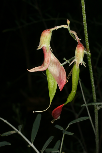 Evergreen shrub with slender, erect, twiggy, white-downy stems and pinnate hairy, grey-green leaves, 6-10cm long, each with 13-21 small, oblong to linear-elliptic leaflets on densely white-downy midribs. From late spring to summer, bears racemes, to 8cm long, of pea-like, bright red flowers, 2.5-5cm long. Followed by inflated, broadly ellipsoid to almost spherical, greenish yellow, occasionally red-flushed seed pods, to 5cm long.