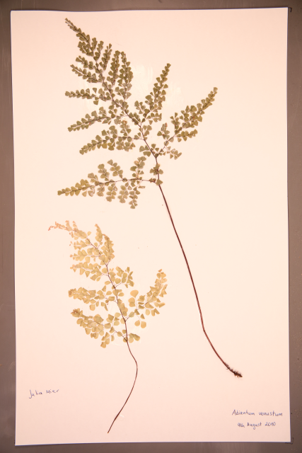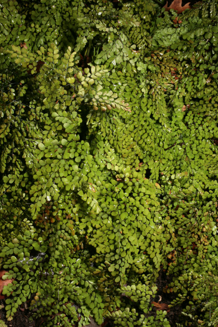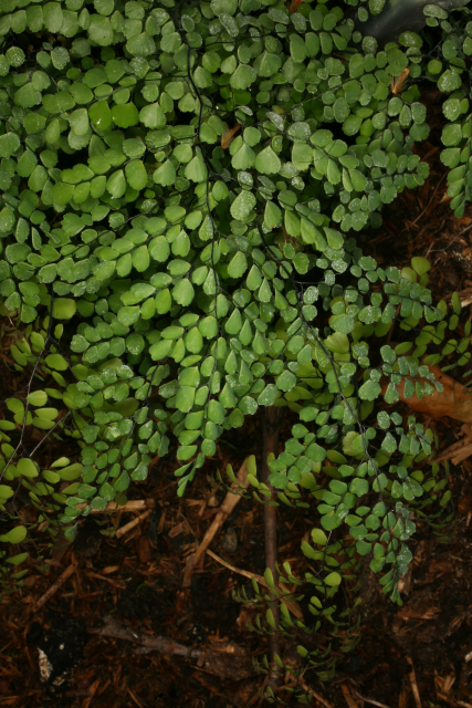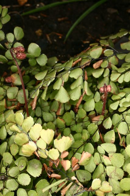 Adiantum venustum D.Don Adiantaceae (although placed by some in Pteridaceae). Himalayan maidenhair fern. Small evergreen hardy fern. Distribution: Afghanistan-India. It gains its vernacular name from the wiry black stems that resemble hairs. Adiantum comes from the Greek for 'dry' as the leaflets remain permanently dry. A related species has been used medicinally. The Cherokee used A. pedatum to make their hair shiny. Henry Lyte (1576), writing on A. capillus-veneris, notes that it restores hair, is an antidote to the bites of mad dogs and venemous beasts; helpeth shortness of breath and excess phlegm; treats kidney stones, periods, helps deliver the placenta, and more. Linnaeus (1782) recommended it for intestinal obstruction.