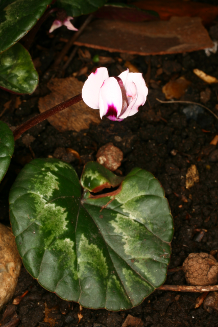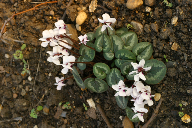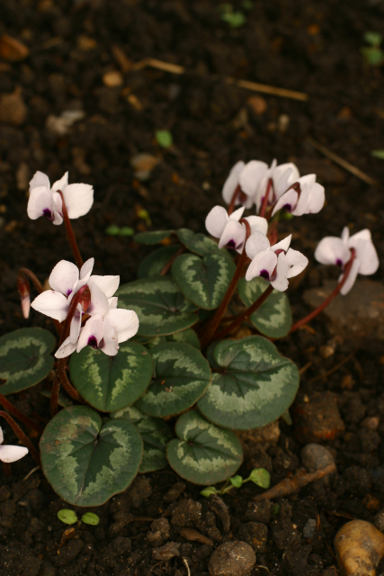 The Cyclamen genus contains 23 species. In the wild, their distribution is centred on the Mediterranean, being natives of parts of Europe, western Asia and parts of North Africa. Cyclamen are tuberous plants that have no obvious affinity with primroses (despite being in the same family). They do resemble the North American Dodecatheon in having reflexed petals. Their habitats range from beech woodland, through scrub and rocky areas, to alpine meadows where they flower in snow meltwater. The genus is notable for the fact that although it is small, there are species which flower in every month of the year.