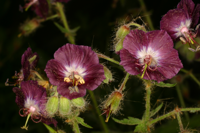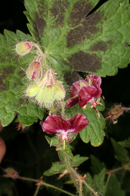 Geranium phaeum L. Geraniaceae Dusky cranesbill. Herbaceous perennial. Distribution: Europe. This seems to be the 'Dove's foote', Geranium alterum, of Lyte (1578). He says it is 'not good in Medicyne. Notwithstanding at this time, it is much used against all woundes, and ulcers being laid thereunto.'. Parkinson (1640) classifies cranesbills somewhat differently, but says that 'all are found to be effectual both in inward and outward wounds, to stay bleedings, vomitings and fluxes, eyther the decoction of the herbe or the powder of the leaves and roots used as the cause demands.' No current medicinal use.