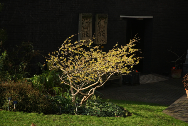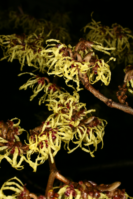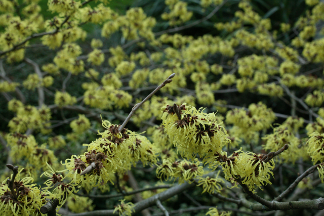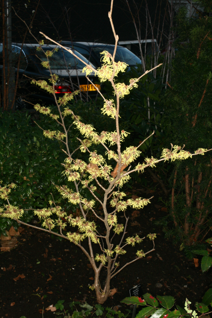 Erect shrub with broadly oval, obovate, or nearly rounded leaves, to 15cm long. Turning a magnificent yellow in autumn. It has clusters of large, sulphur-yellow flowers in mid-late winter. 4m high and wide. Grow in moderately fertile, moist but well-drained, acid to neutral soil in full sun or partial shade in an open but not exposed site. Witch hazels also tolerate deep, humus rich soils over chalk. Sow seed in containers in a cold frame as soon as ripe. Graft cultivars in late winter, or bud in late summer.