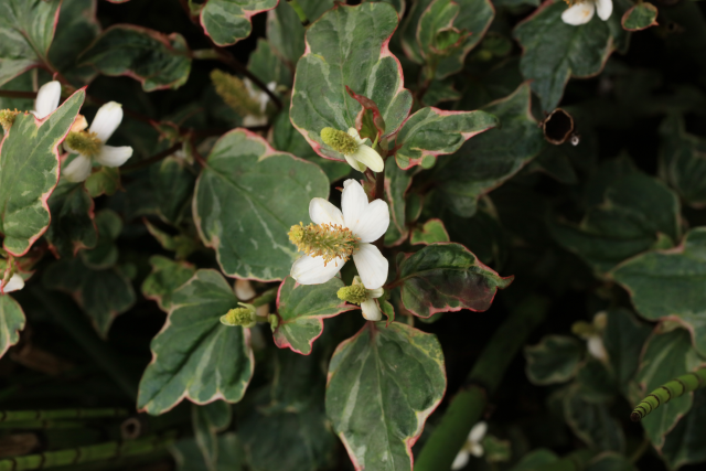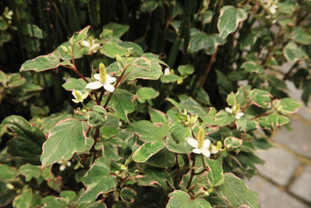 This hardy, perennial member of the Saururaceae family is native to moist woodlands and marshy areas from the east Himalayas to Japan. It prefers to grow in rich, damp soil in sun or partial shade. At the Medicinal Garden we grow its cultivars in pots on a sunny terrace. It has aromatic heart-shaped leaves and small white flowers. Stock can be easily increased by dividing clumps in spring (Clare Beacham)
