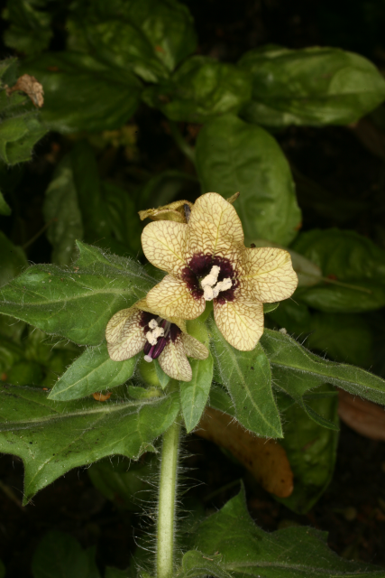 Notes by Henry Oakeley from Lindley's 'Flora Medica' (1838): Henbane, derived from the Anglo-Saxon word for ‘killer of hens’, is the source of the atropinic-like alkaloid hysocine (also called scopolamine). Like many medicines, especially those derived from the Solanaceae family to which it belongs, it is dangerous in overdose. It is used as a premedication prior to anaesthesia as it dries up bronchial secretions, is sedative, anti-emetic and causes a tachycardia that counteracts the bradycardia induced by some anaesthetic agents. It may cause excitement and hallucinations, similar to atropine. In medicine today it is given by injection, but in the past, like Datura, the leaves were smoked as a tobacco substitute. Lindley noted all of this, writing ‘A powerful narcotic, the capsules and seeds of which, smoked like Tobacco, are a rustic remedy for toothache, but convulsions and temporary insanity [viz confusion and hallucinations] are said to be sometimes the consequence of their use. Used medicinally the leaves produce effects very similar to those of opium. It is employed with advantage in ... painters’ colic [it reduces smooth muscle contractions] and mania [it is sedative]... the infusion dropped into the eyes dilates the pupil like Belladona [Atropa belladonna, Deadly Nightshade]’. Datura cigars were smoked to treat asthma in the early years of the NHS.