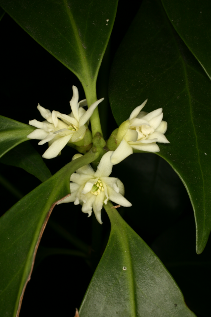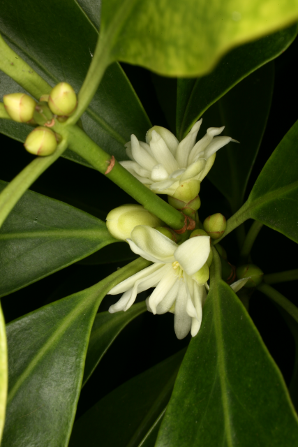 Japanese Star Anise; Illicium religiosum; shi-kimi . Illicium comes from the Latin for Allurement, referring to the aromatic scent, anisatum indicating a scent like anise.