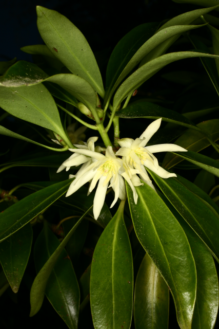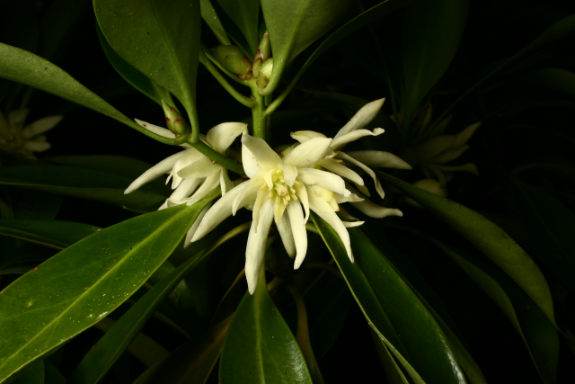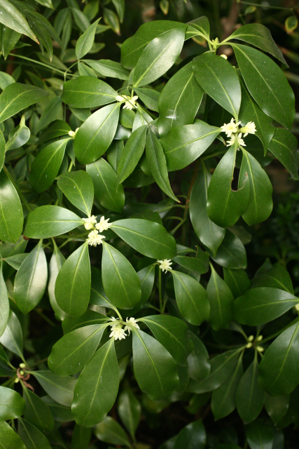 The star-shaped seed pods give these two plants their common name, but they are very different. Illicium anisatum, Japanese star anise, contains nasty neurotoxins. It should not be confused with Illicium verum, Chinese star anise, a culinary spice also used to make star anise tea. Illicium seed pods (mostly from I. verum) contain shikimic acid from which ‘Tamiflu’ (oseltamivir), a treatment for bird and swine flu, is made. Neither extracts from the plants nor shikimic acid itself have any effect as antiviral agents. These plants are also the source of an anti-cancer treatment that is an angioneogenesis inhibitor (ie it stops the production of the blood supply to the tumour). This property is also used to prevent the little tubes, the ‘stents’ that are used to open up blocked coronary arteries, from clogging up. The stent is impregnated with the chemical and this leaches out slowly, acting like anti-fouling paint and so preventing the coronary artery lining from growing inside the stent