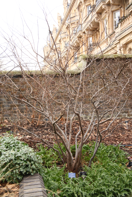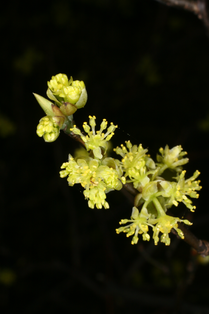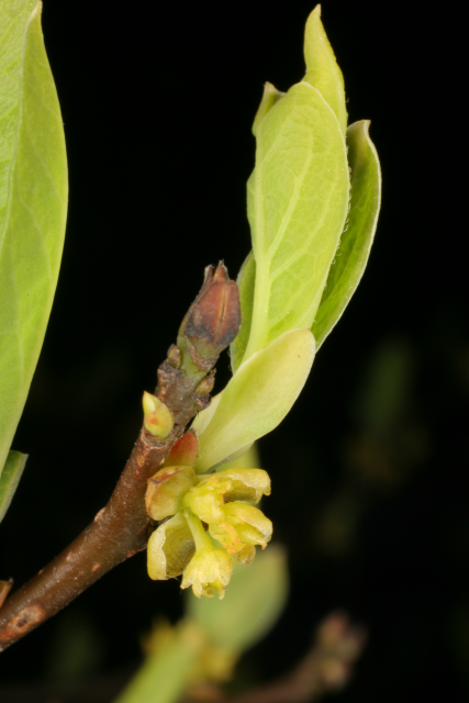 Lindera benzoin in the family Lauraceae is native to the wooded slopes and streams of south-east Canada and eastern USA. A hardy, deciduous shrub, its greenish-yellow flowers appear on bare branches in spring followed by aromatic leaves, bright-red fruit and yellow autumn colour. It prefers moist, acidic soil so is mulched annually with leaf mould and fed with a seaweed-based fertiliser during the growing season. We prune it in spring only to remove dead and damaged wood, but it can be cut back hard to the base if necessary.(Clare Beacham)