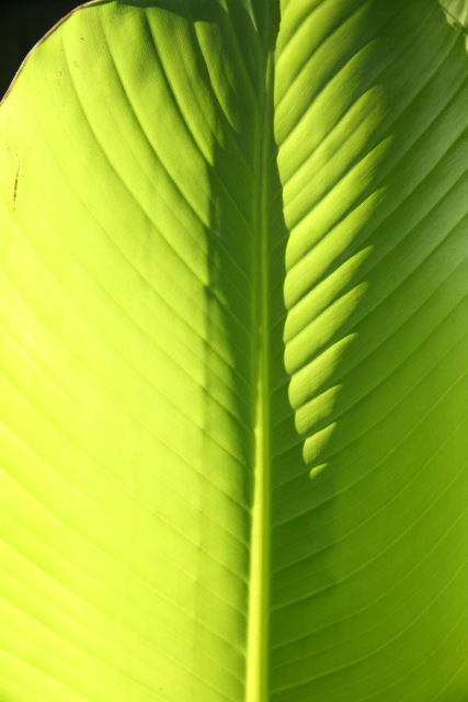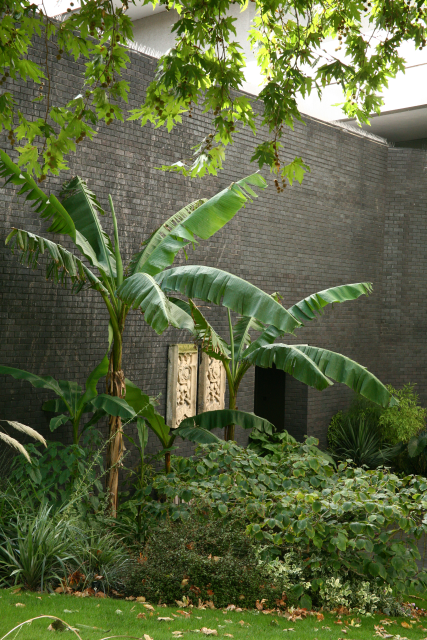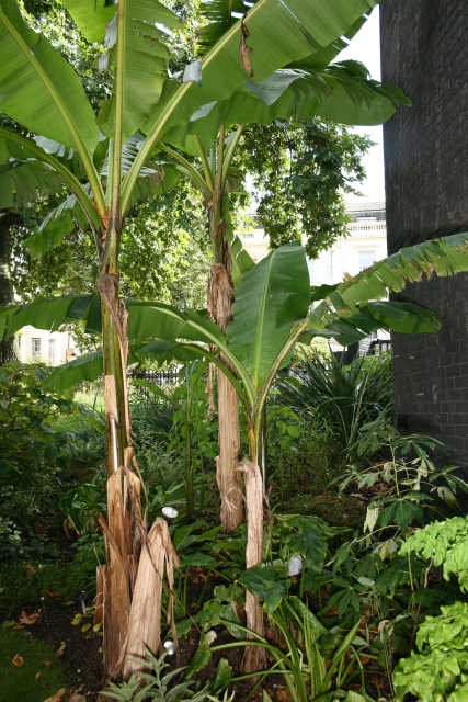 Musa basjoo in the family Musaceae is a herbaceous perennial originating in the Far East and is the hardiest of banana plants. In a partially shaded, well-drained border it produces pendant spikes of cream flowers with brown bracts and very large, attractive, bright-green leaves which are prone to wind damage, so a sheltered site is preferred. In severe winters the plant may die back completely but will regrow from the base in spring. We give it a generous layer of bark mulch or Taxodium needles around the crown for protection.(Clare Beacham)