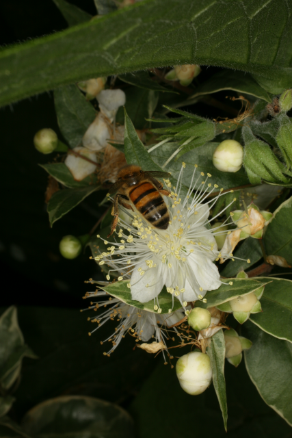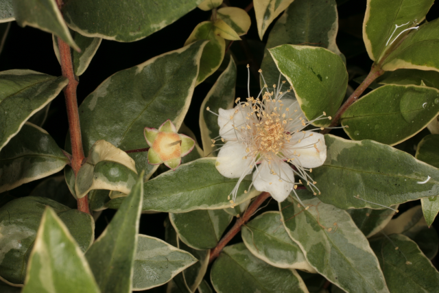 Myrtus communis L. Myrtaceae Myrtle 'Variegata' Distribution: Europe. Dioscorides (Beck, 2005) recommends the fruit for treating haemoptysis (‘spitting blood’) and cystitis, and, if boiled, he said it made a fine wine. In various forms it was used as a hair dye, for sore eyes, anal and uterine prolapse, dandruff and shingles, all sorts of inflammations, scorpion bites and even sweaty armpits. Our plant has white berries, but he regarded those with black berries (they become black later in the season) as being more effective. Lyte (1578) adds that the juice of the berries kept the hair black and stopped it falling out, and prevented intoxication. He notes that it only flowered in hot summers in England, but it is reliable in flower now, either due to global warming or selection of suitable clones.