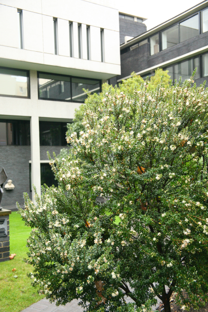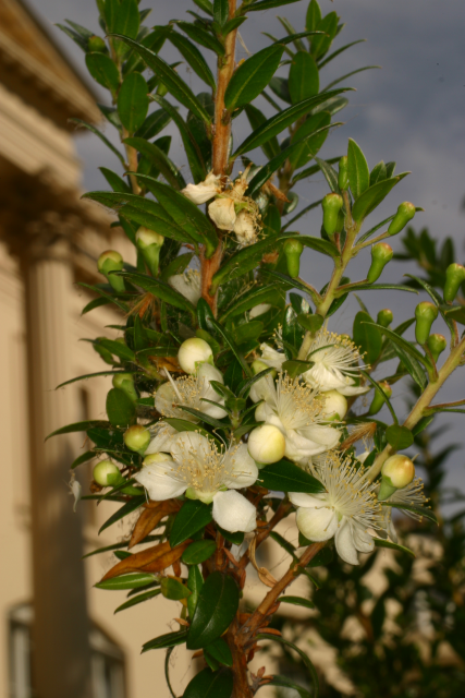 These notes refer to the species Myrtus communis L. Myrtaceae Myrtle . Distribution: Europe. Dioscorides (Beck, 2005) recommends the fruit for treating haemoptysis (‘spitting blood’) and cystitis, and, if boiled, he said it made a fine wine. In various forms it was used as a hair dye, for sore eyes, anal and uterine prolapse, dandruff and shingles, all sorts of inflammations, scorpion bites and even sweaty armpits. Our plant has white berries, but he regarded those with black berries (they become black later in the season) as being more effective. Lyte (1578) adds that the juice of the berries kept the hair black and stopped it falling out, and prevented intoxication. He notes that it only flowered in hot summers in England, but it is reliable in flower now, either due to global warming or selection of suitable clones.