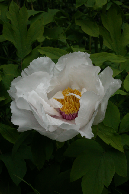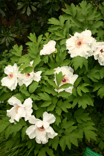 Paeonia suffruticosa Andrews 'Bai Yu' Distribution: China. The peony commemorates Paeon physician to the Gods of ancient Greece (Homer’s Iliad v. 401 and 899, circa 800 BC). Paeon, came to be associated as being Apollo, Greek god of healing, poetry, the sun and much else, and father of Aesculapius/Asclepias. Paeonia suffruticosa was introduced to horticulture by Sir Joseph Banks (1743-1820). A root extract in 25% alcohol has recently been licensed for use for the relief of menopausal hot flushing as an across-the-counter medication in Britain, despite inhibiting clotting mechanisms and causing uterine contractions; lack of toxicity, genotoxicity or genotoxicity trials, and the absence of proof that it works (UK Medicines and Healthcare Products Regulatory Agency (MHRA)).